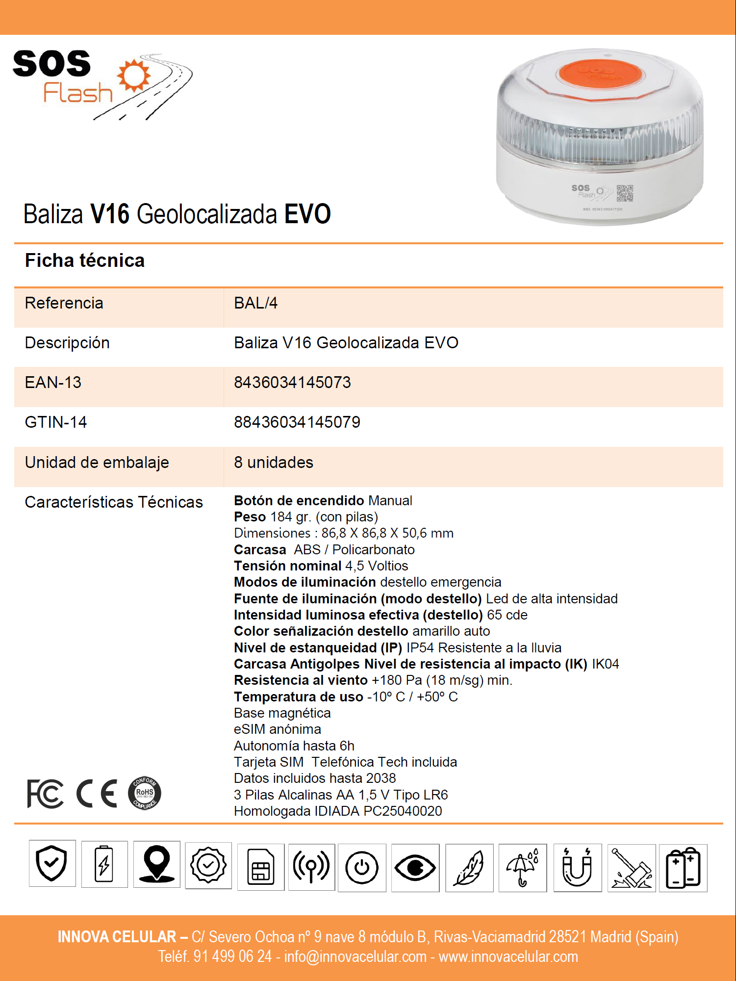 Baliza SOS FLASH BAL/4 Baliza V16 Geolocalizada EVO homologada por la DGT con el nº : IDIADA PC25040020